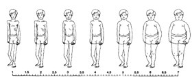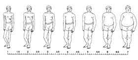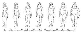 The following protocol is taken from a personal interview study in which study participants are asked to self-report about their own body image and then report about first-degree family members. Please refer to the following adult and child pictures below to answer the following questions about yourself and your first-degree family members (e.g., mother, father, and/or children). TO BEGIN: Step 1: Look at the pictures below of males or females and try to choose the picture that most closely resembles how you looked at each age listed below. Step 2: Look at the adult and child pictures. Choose the picture that most closely resembles your (or your child’s) body shape right now and at the ages of 5, 10, and 20. The child pictures should be used for ages 5 & 10 and the adult pictures for ages 20 or older. Editor’s Note: The participant is shown pictures that display various body shapes associated with a scale. For adults, three scales are provided here. The Stunkard graphics show nine images for men and for women. Consequently, the responses should be recorded on a form that includes 1 through 9. Pulvers et al. provided graphics validated for African American men and women on a 1 to 9 scale. Collins presents a range of seven male and seven female figures. Consequently, the forms indicated can be used with those graphics. (The Working Group was not aware of other population-specific graphics.) For children, Collins provides graphics for boys and for girls on a 1 to 7 scale. All graphics are provided below.