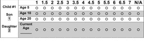 This measure is used to assess an individual’s perception of his or her (and his or her children’s) body image. Self body image historically and currently, and body image of one’s children, is a useful indicator of health (i.e., predictive of weight status, diabetes, hypertension, and coronary disease) and mental well-being. Also, differences between self-perceived body image and measured status have been used to evaluate distorted body image in studies of eating disorders or other psychological or behavioral factors.
