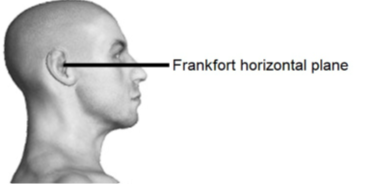 2. Second, align the head in the Frankfort horizontal plane. The head is in the Frankfort plane when the horizontal line from the ear canal to the lower border of the orbit of the eye is parallel to the floor and perpendicular to the vertical backboard (Exhibit 3-5). Many people will assume this position naturally, but for some SPs the examiner may need to gently tilt the head up or down to achieve the proper alignment. Instruct the SP to look straight ahead. Next, lower the stadiometer head piece so that it rests firmly on top of the participant’s head, with sufficient pressure to compress the hair. Instruct the SP to stand as tall as possible, take a deep breath, and hold this position. The act of taking a deep breath helps straighten the spine to yield a more consistent and reproducible stature measurement. Notice that the inhalation will cause the head piece to rise slightly.