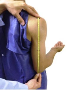 First, the upper arm length is measured using bone landmarks, and the midpoint distance is marked for the circumference measurement. Measure the right arm at the level of the upper arm midpoint mark.