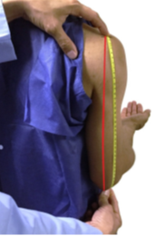 2.    Mark the Measurement Site. Locate the end of the spine of the right scapula by following the scapula out to the arm until it makes a sharp V-turn to the front of the body (Exhibit 2). Using the cosmetic pencil, make a horizontal line on the uppermost edge of the posterior border of the spine extending from the acromion process (see Exhibit 3).