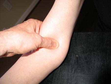 b. Locate the brachial artery by palpation and mark the skin with a small dot, using a black pen. (The brachial artery is usually found just medial and superior to the cubital fossa, posterior to the biceps muscle and slightly toward the body.) For brachial artery palpation, fingertips or thumb may be used (see figure below).
