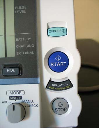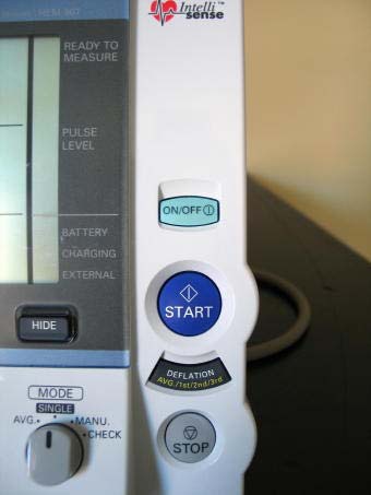 The design and operation of the Omron® HEM907XL are based upon the combined principles of compression of the brachial artery under an elastic, inflatable cuff and estimation of the systolic and diastolic BP levels by oscillimetric methods. The technician should place the correct size cuff on the participants arm, set the machine to automatic, set the mode button to single, and push the start button on the monitor, then wait for the output. All readings are to be recorded to the nearest digit.